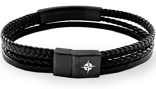 - браслет выполнен из черной плетеной и гладкой кожи;
