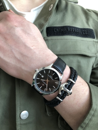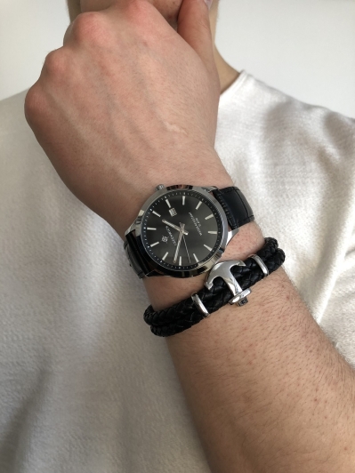 Массивный корпус часов с полированным безелем сделан из гипоаллергенной нержавеющей стали. Она обладает антимагнитным эффектом, повышая, таким образом, точность работы кварцевого механизма. Полированный циферблат вмещает крупные часовую и минутную стрелки. Хорошо читается и секундная стрелка, которая отсчитывает секунды по маркированному кругу. Индикатор в положении «3 часа» показывает дату. Надежный японский механизм обеспечивает бесперебойную работу. О качестве часов говорит повышенная водостойкость — 10 атмосфер. Модель дополняет плотный ремешок из натуральной кожи с прошивкой или литой браслет из нержавеющей стали с раскладывающейся застежкой. Бренд Greenwich отличается вниманием к деталям. На заводной головке и задней крышке расположился логотип: стилизованное изображение розы ветров. На задней крышке — гравировка корабля, плывущего навстречу приключениям.
